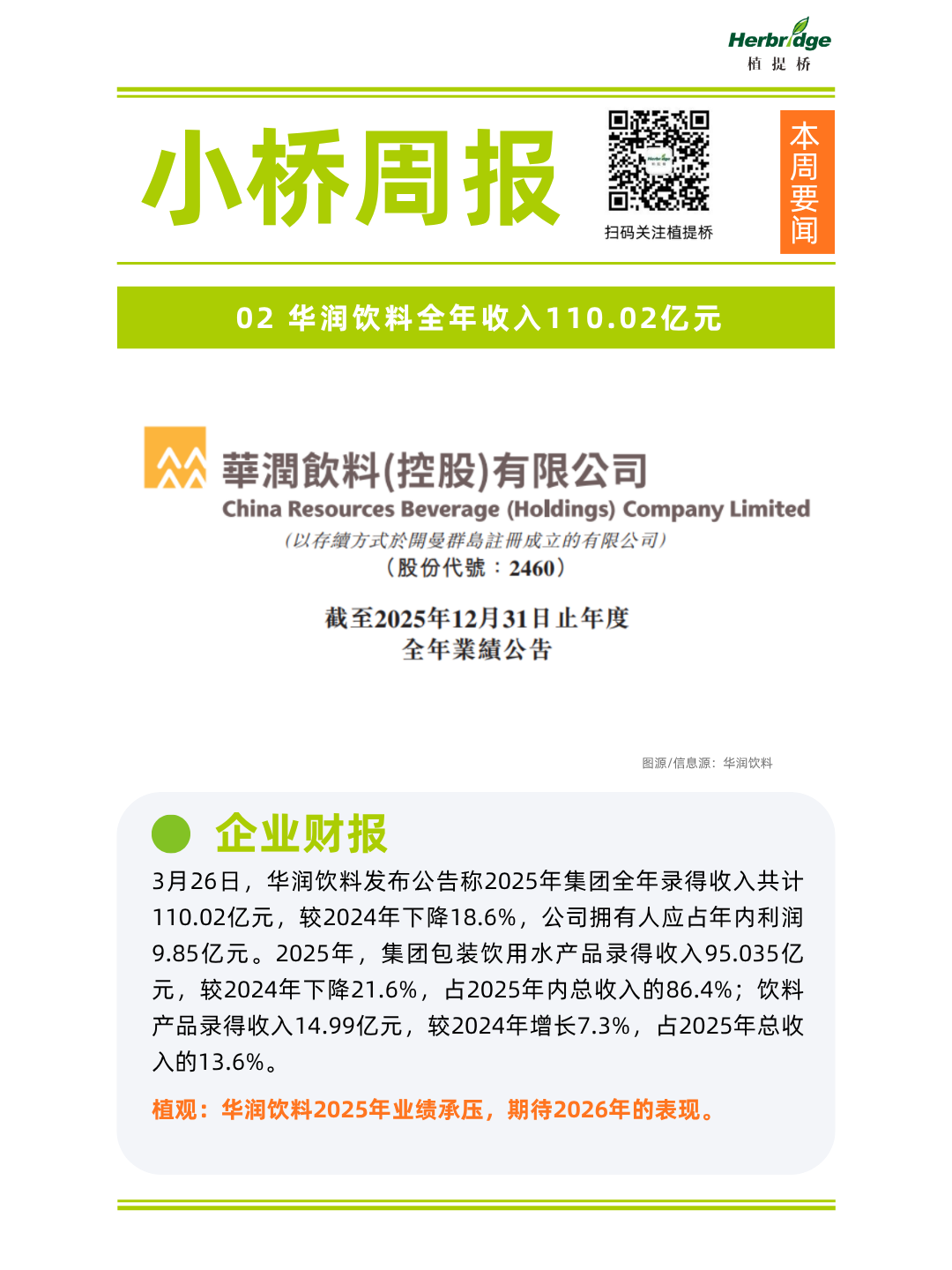2、华润饮料全年收入110.02亿元