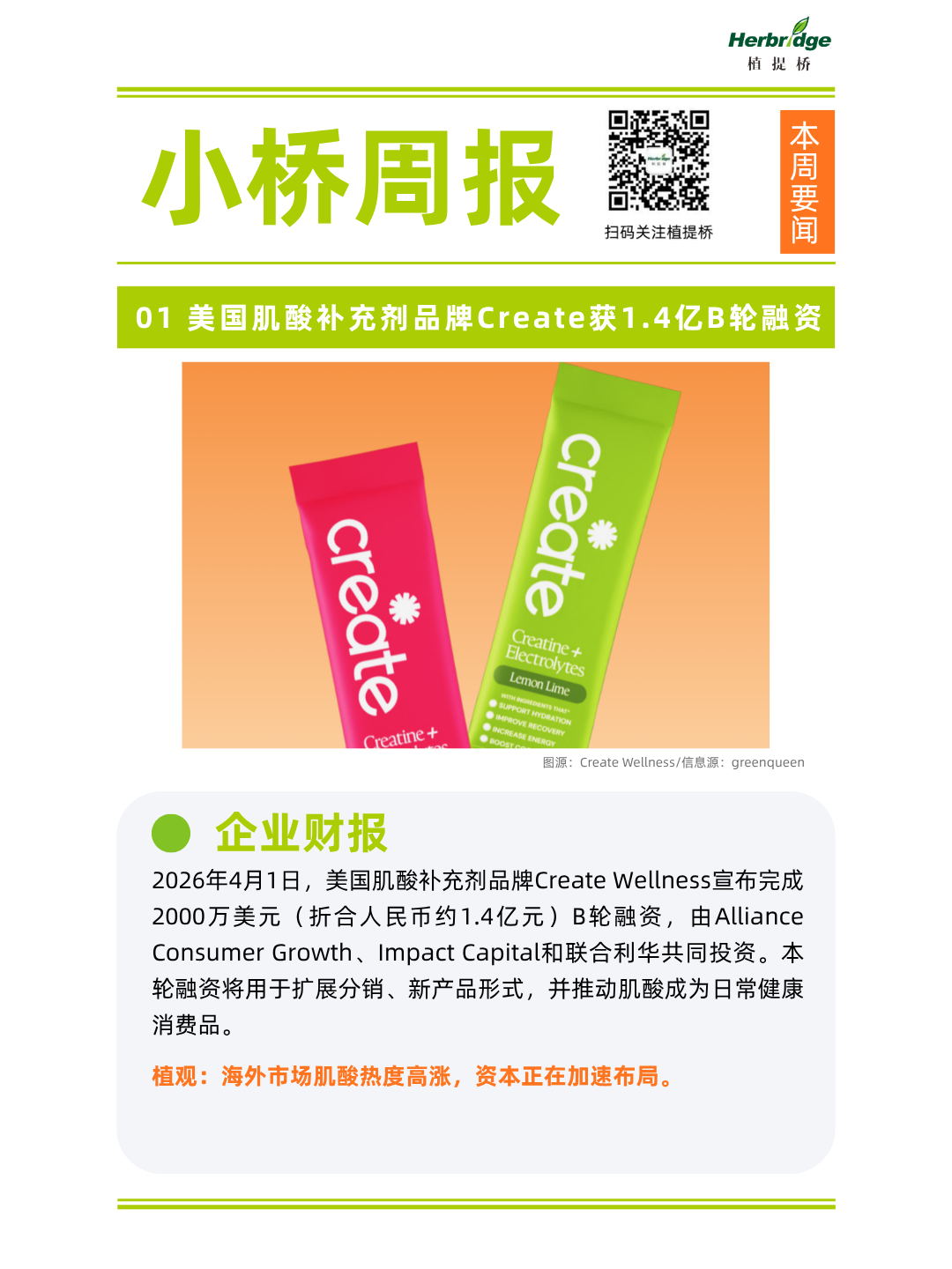 1、美国肌酸补充剂品牌Create获1.4亿B轮融资