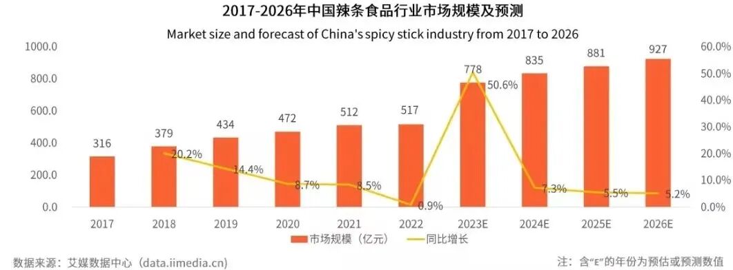 艾媒咨询数据显示,中国辣条食品市场持续增长,2026年有望达927亿元。