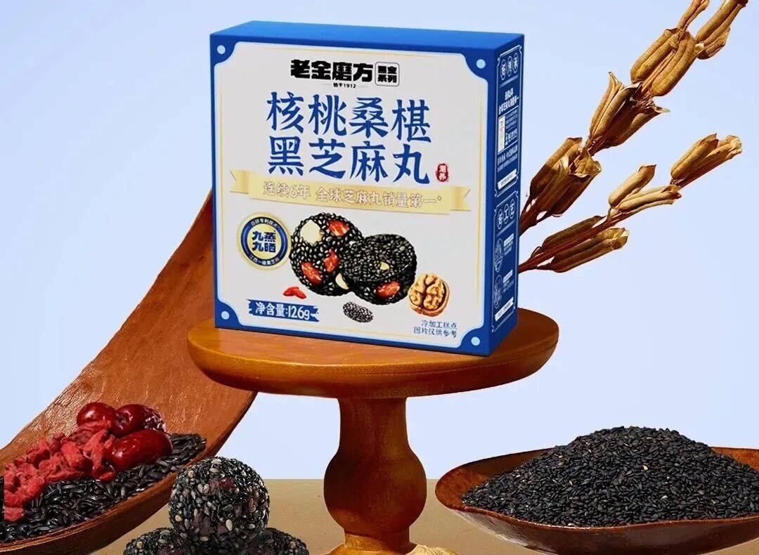 另外我们熟悉的老金磨方,也是聚焦中式养生零食,产品多以药食同源食材为核心。热门的产品有黑芝麻丸,还有核桃芝麻粉、红枣桂圆糕等,都是独立小包装,开袋即食,主打补气血、养头发,适配日常养生场景。