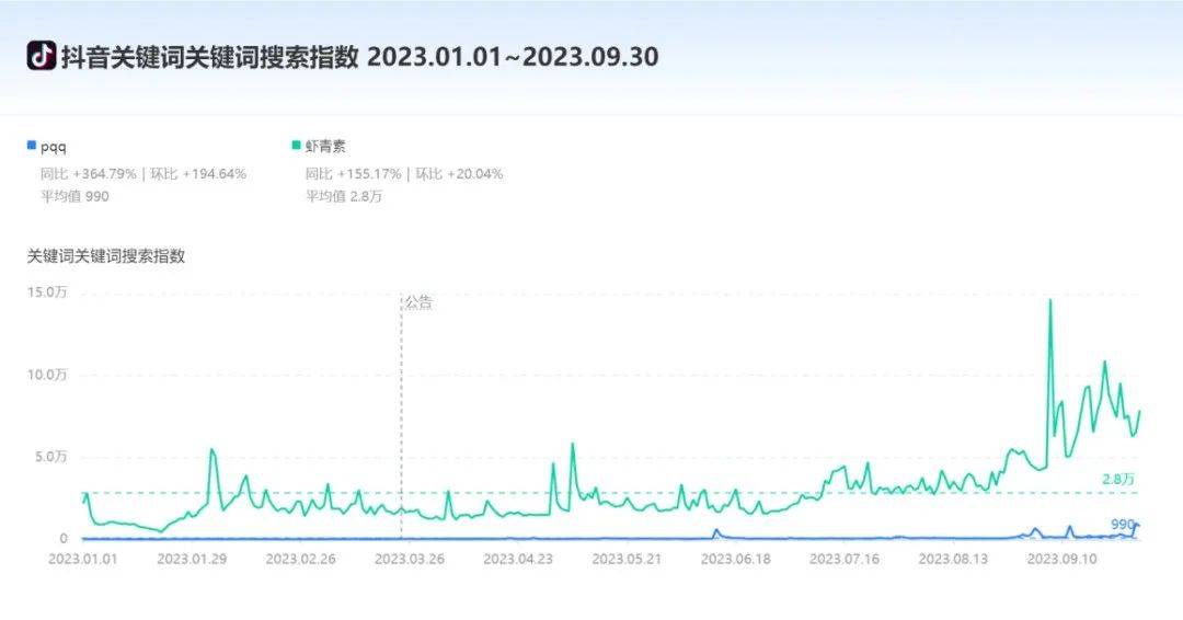 但对比一下出圈原料,如虾青素,同一周期的搜索平均值为2.8万。两者之间的差距仍有非常大的距离。