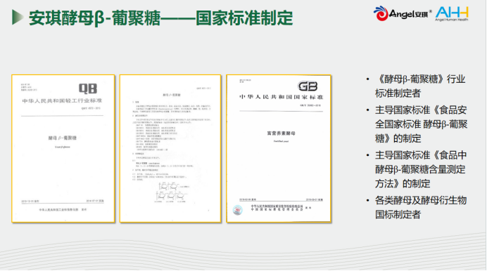 标准制定:安琪酵母参与制定酵母β-葡聚糖的国家标准。在酵母β-葡聚糖的国家标准制定中发挥了重要作用,不仅参与了所有相关国家和行业标准的制定,还主导了两项国家标准的制定。