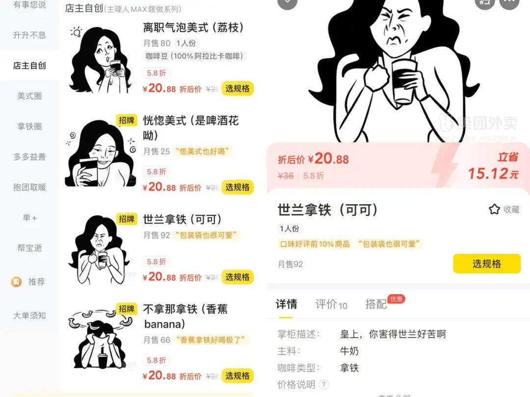 wave coffee则是将发疯文学运用到了极致,美团菜单上每款咖啡并没有实物,而是配上表现打工人日常上班状态的手绘。