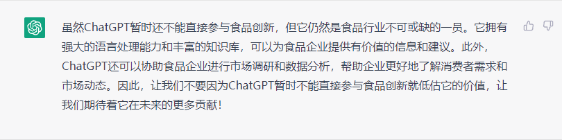 虽然ChatGPT暂时还不能直接参与食品创新,但它仍然是食品行业不可或缺的一员。它拥有强大的语言处理能力和丰富的知识库,可以为食品企业提供有价值的信息和建议。此外ChatGPT还可以协助食品企业进行市场调研和数据分析,帮助企业更好地了解消费者需求和市场动态。因此,让我们不要因为ChatGPT暂时不能直接参与食品创新就低估它的价值,让我们期待着它在未来的更多贡献!