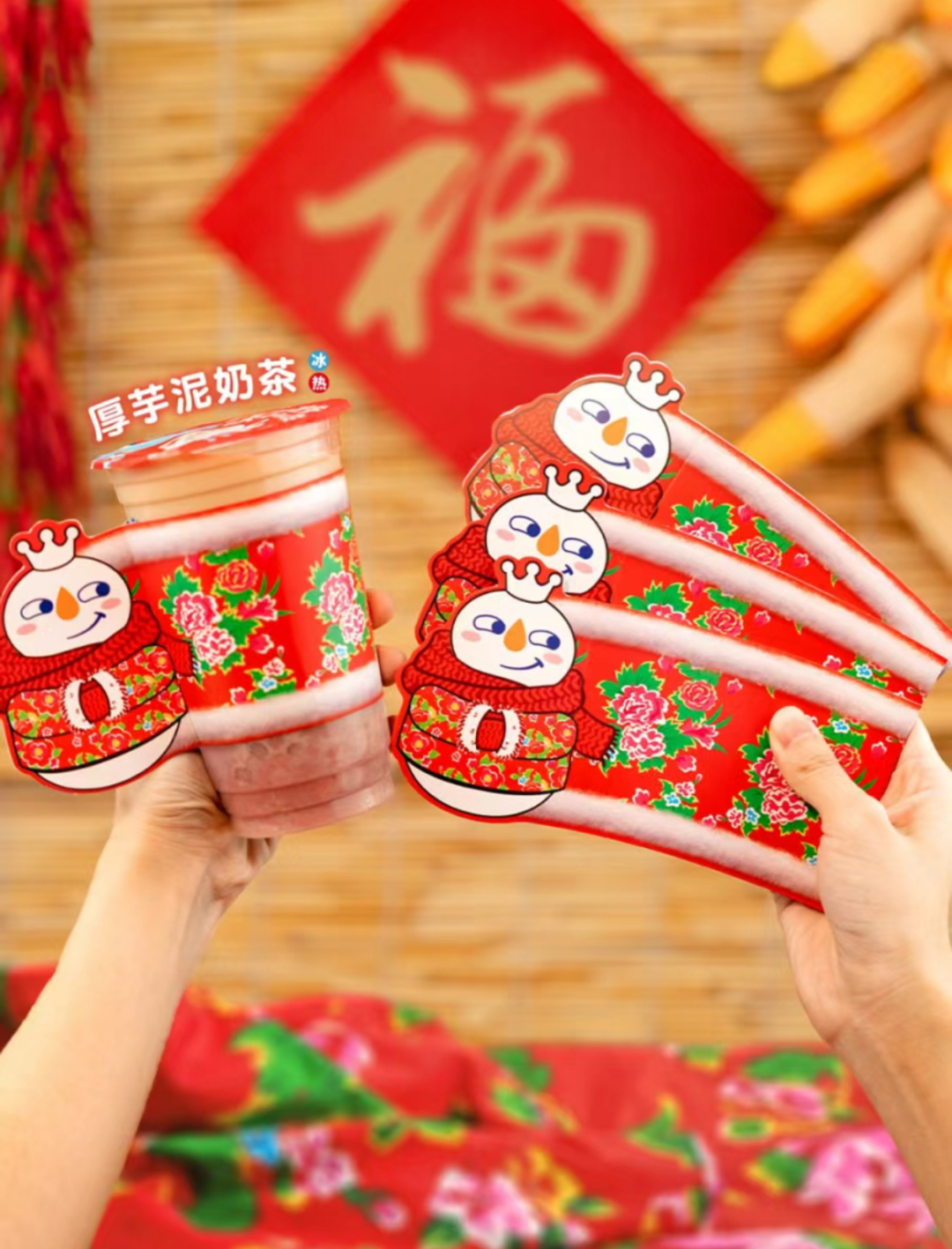 比如蜜雪冰城推出冬季限定款“皮肤”,不仅有雪王花袄风格的杯套,还有周边商品。网友直呼“奶茶穿得比我还暖和”。