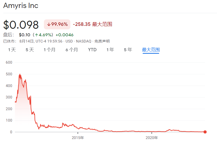 源自青蒿素研究的理想主义,Amyris将这种观念渗透到整个合成生物学领域,并且在选品方面出现了“失误”,整个团队选择了“法尼烯”,聚焦生物燃料赛道,经过经过两三年的商业实践,最终还是失败了,股价也从高峰期2011年的500美元左右/股跌落到2012年30美元左右/股。
