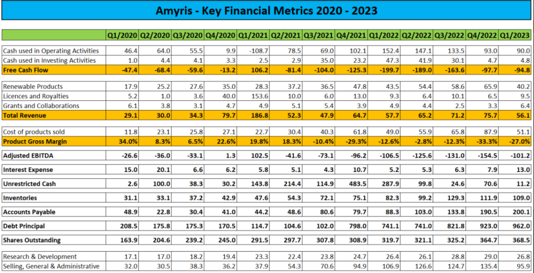 截至到2023年Q1季度结束,Amyris未偿债务本金增至9.62亿美元,虽然在2023年2月跟奇华顿达成化妆品原料售卖协议,但依旧入不敷出。