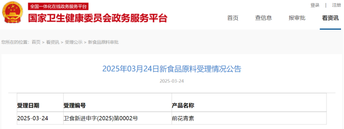 在卫健委2024年第5号公告,批准海岸松的树皮来源的前花青素为新食品原料。