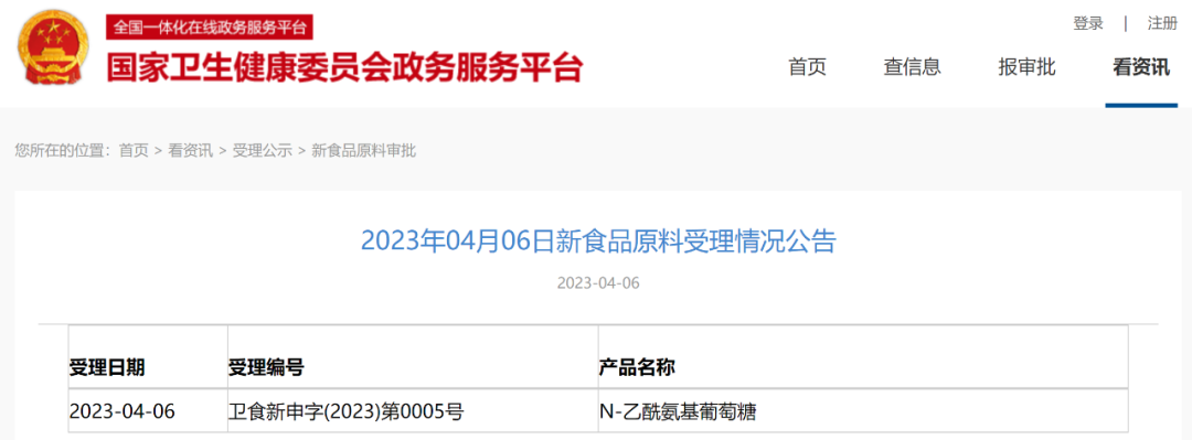 上个月(2023年4月),卫健委受理N-乙酰氨基葡萄糖新食品原料申报。这是一款和骨关节健康相关的功能原料。