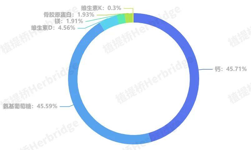 据植提桥对线上海外骨关节膳食补充剂的跟踪调查显示,2022全年该市场中的主力原料仍是氨糖与钙,两者各占45%的市场份额。