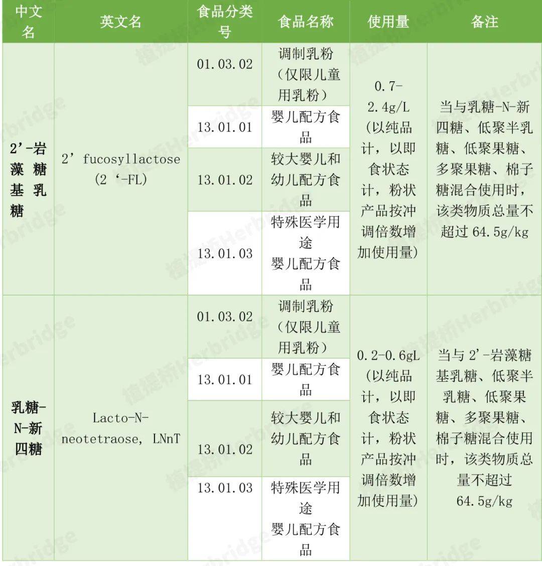 2023年10月7日,国家卫生健康委对外发布公告,两款HMOs成分获得食品添加剂身份,分别是2'-岩藻糖基乳糖(2'-FL)、乳糖-N-四糖(LNT),两者都可应用于婴幼儿配方奶粉、调制乳粉(儿童用)以及特殊医学婴儿食品,具体信息如下:
