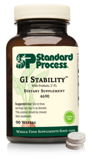Standard Process推出的营养补充剂GI Stability,含有2'-岩藻糖基乳糖(2'-FL)、Collinsonia根提取物、甜菜和秋葵粉。母乳低聚糖2'-FL是一种独特的益生元,可绕过胃部消化直接进入到肠道,充当益生元角色去喂养益生菌,从而支持健康的肠道微生物组。