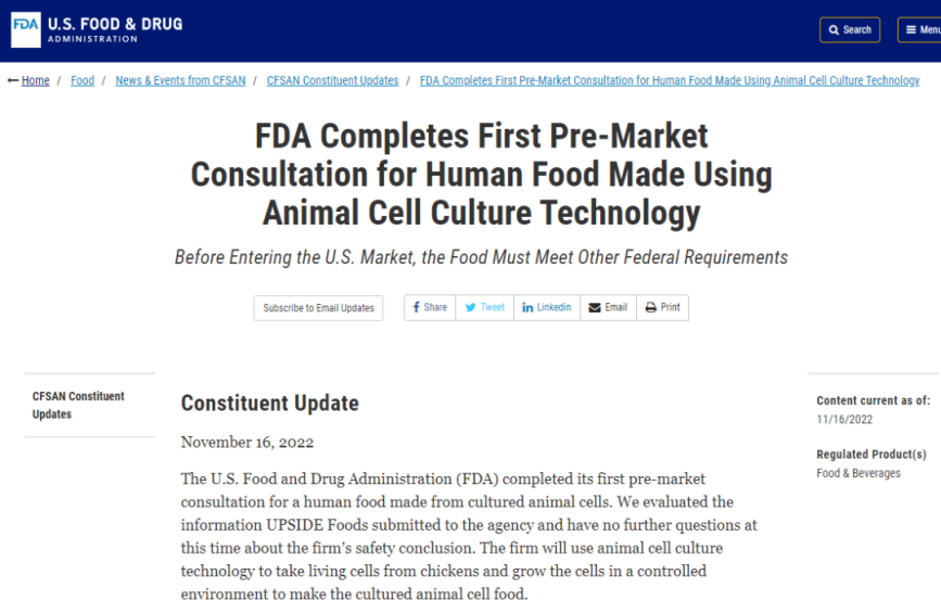 ·2022年11月,美国细胞肉公司Upside Foods获得美国FDA的认可,确认其产品安全、可食用。