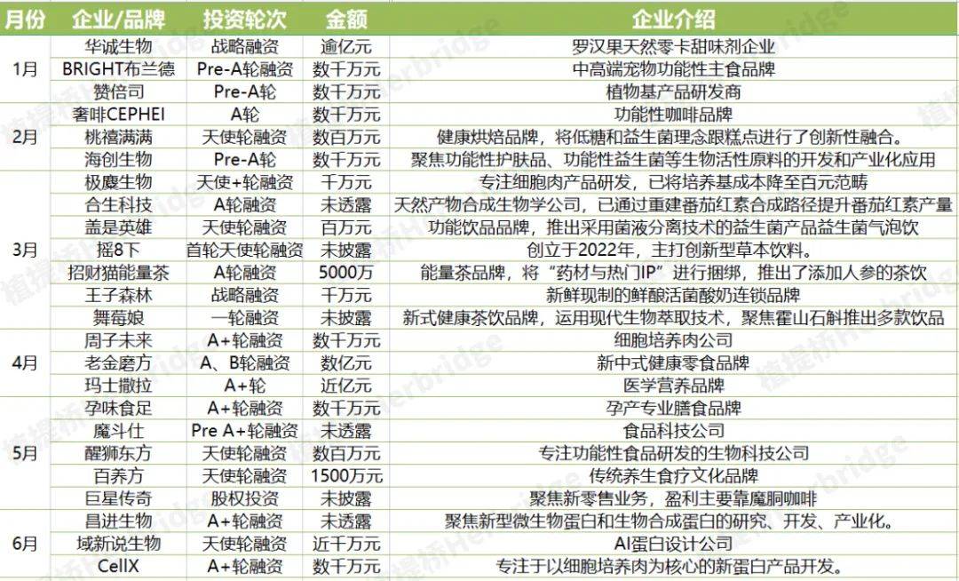 据植提桥不完全统计,营养健康产业在2023上半年完成了24起融资,融资总金额近6亿元,其中有6家企业未披露金额。