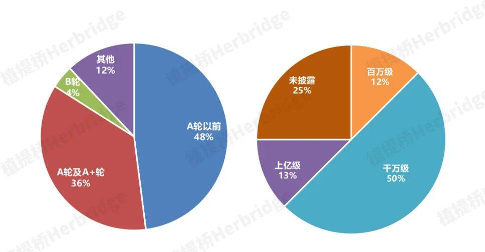 从融资轮次看,早期项目会更受青睐,A轮以前融资占比达到了一半,A轮及A+轮占比为30%左右,B轮融资仅有一起。从融资金额看,千万级占比最高。