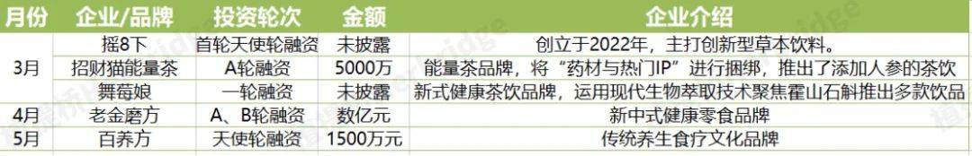 今年上半年,包括草本饮料品牌摇8下、能量茶品牌招财猫能量茶、健康茶饮品牌舞莓娘、传统养生食疗文化品牌百养方、健康零食品牌老金磨方在内的五家企业获得了融资。