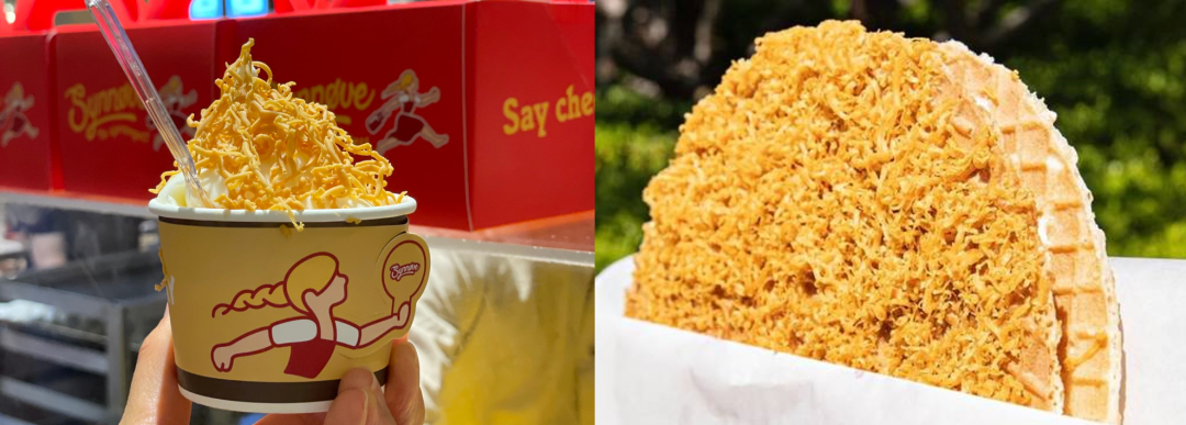 在韩国,棕色奶酪还衍生出多种吃法,比如刨丝后搭配冰淇淋、华夫饼、甚至是披萨,许多人表示喜欢这种咸甜组合的口味。“我不太喜欢奶酪。但我就是爱上它又粘、又咸、又甜的味道。”