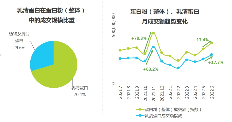 另一方面,受疫情影响,消费者健康意识增强,期望通过乳清蛋白提升自身免疫力,乳清蛋白的购买人数、频次均上升。据艾媒咨询统计,2021年以来,“乳清蛋白粉”基本上占据蛋白粉成交额的七成左右。