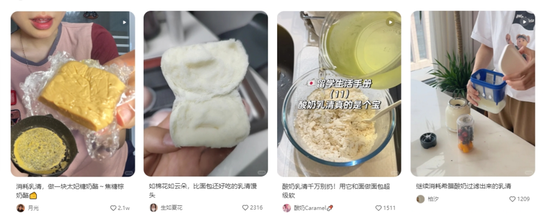 更多的创新智慧来自民间。在社交媒体上,利用自制酸奶的剩余乳清或乳清蛋白粉制作各类美食的内容随处可见,涉及到烘焙食品、饮品、馒头,甚至是棕色奶酪。分享者表示,使用乳清制作的面包和馒头更加蓬松宣软,口感更佳。