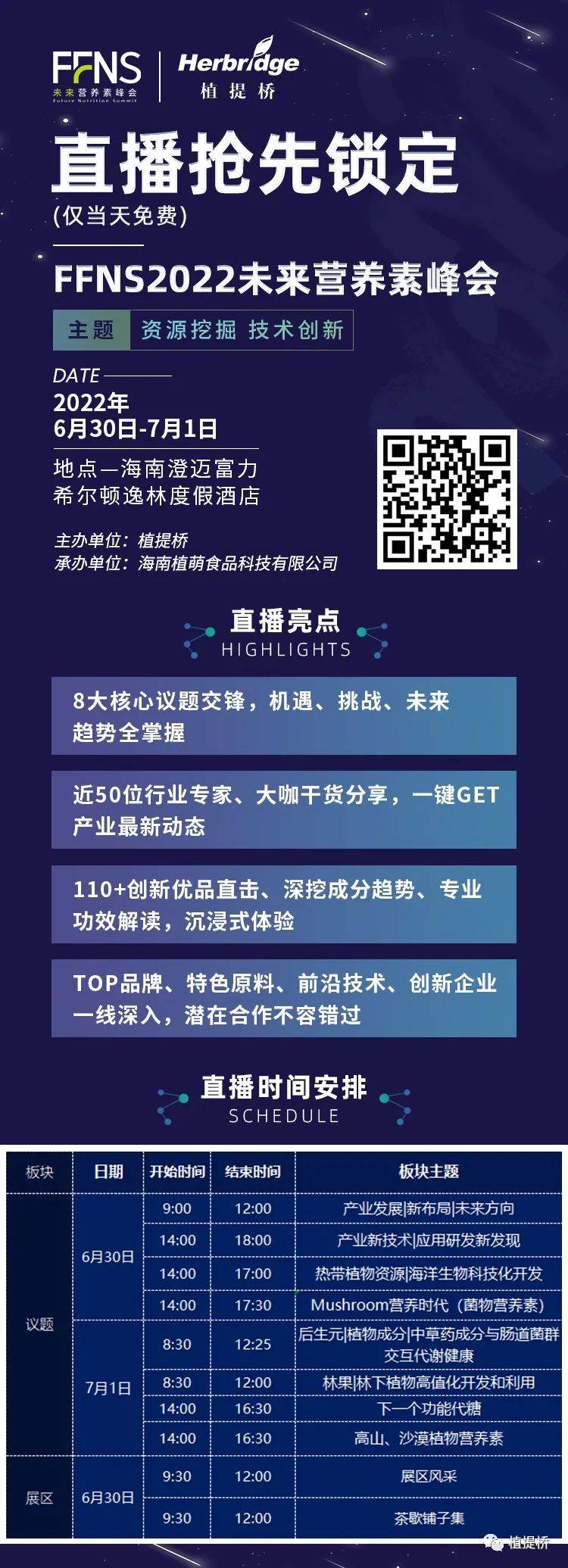 由植提桥主办的FFNS2022未来营养素峰会将于6月30日至7月1日在海南澄迈富力希尔顿逸林度假酒店举行。为了大家能够直击峰会精彩亮点、也为了方便所有嘉宾和参会人员顺利参会,会务组精心准备了参会指南,并特别制定疫情防控措施及出行指导,以供参考。
