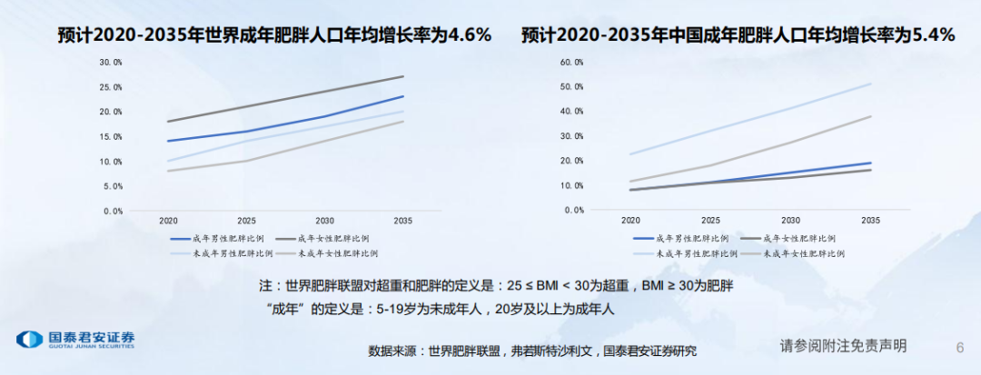 世界肥胖联盟发布的《2023年世界肥胖地图(World Obesity Atlas 2023)》数据预测,全球超重或肥胖人数将由2020年26亿增加至2035年40亿,其中成年肥胖人口年均增长率达4.3%,未成年肥胖人口年均增长率为5.4%;中国成年肥胖人口年均增长率为5.4%,未成年肥胖人口年均增长率为6.6%,高于全球平均增速。