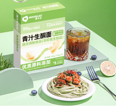 MOODLES魔斗仕推出的0碳水生酮主食产品青汁生酮面,采用鸡胸肉、椰子油、猪油作为原料制成。其中,鸡胸肉含量≥50%、椰子油含量≥8%、猪油含量≥8%。采用3D打印分子料理技术,24g脂肪可达成72%的脂肪供能比,同时特别添加5%的大麦嫩苗粉,为消费者提供“更好的”主食代餐选择。