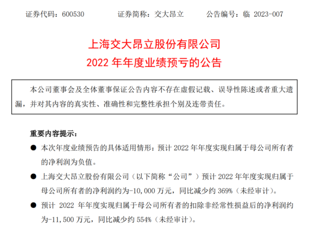1月31日,交大昂立(600530)发布全年业绩预告,公司预计2022年1-12月业绩预亏,归属于上市公司股东的净利润为-1.00亿,净利润同比下降369%。