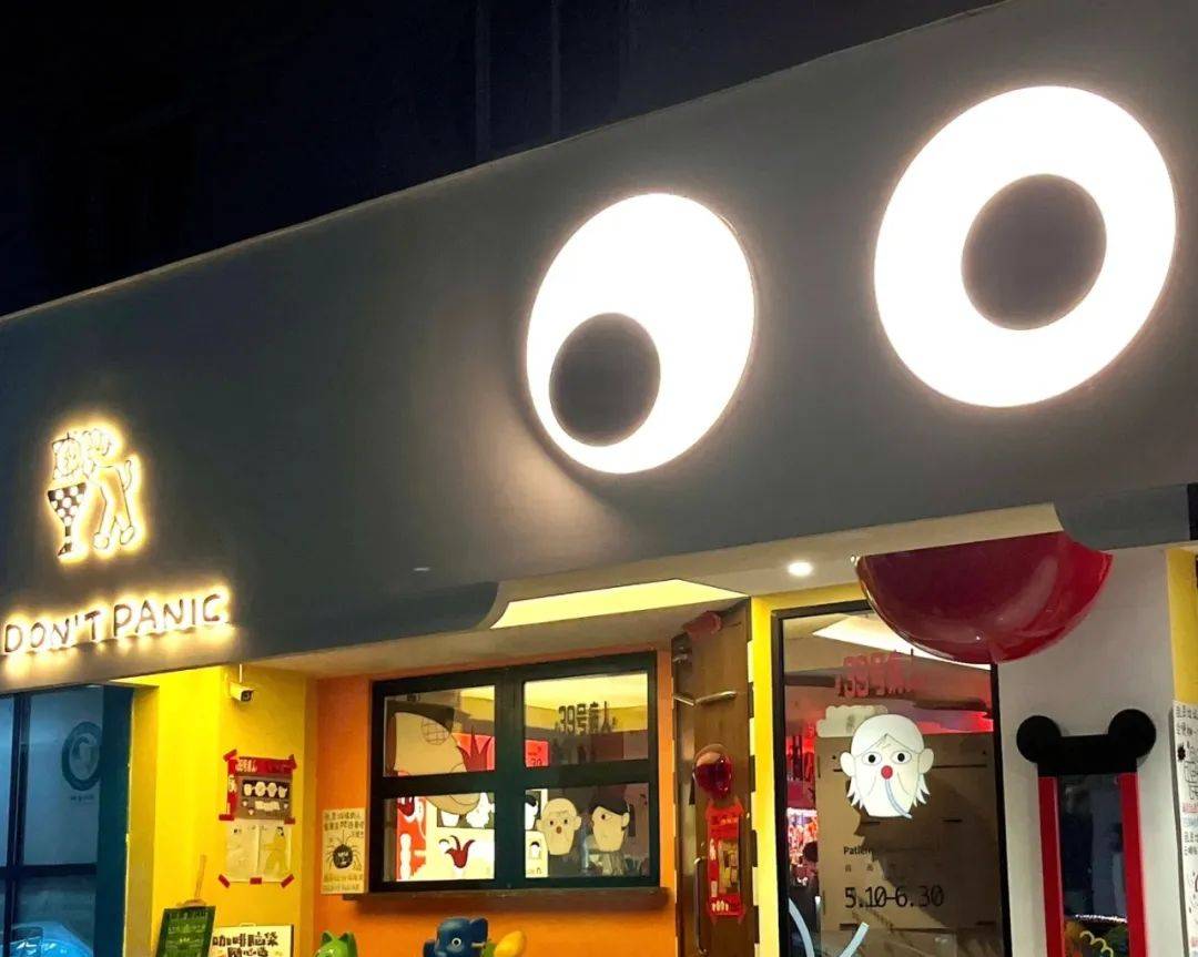 南昌的Totoao凸凸凹甜品,门头使用大面积红、黄、蓝色,还在视觉中心挂了一对眼睛。很多顾客被生动可爱的门头吸引进店。