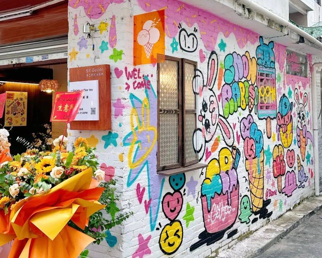 顺德的SR Gelato冰淇淋茶饮店,原本外墙只是普通的白色,涂鸦师将其IP形象雪兔融入涂鸦设计,加上五颜六色的雪糕,放眼望去少女心满满,吸引了许多顾客到店。