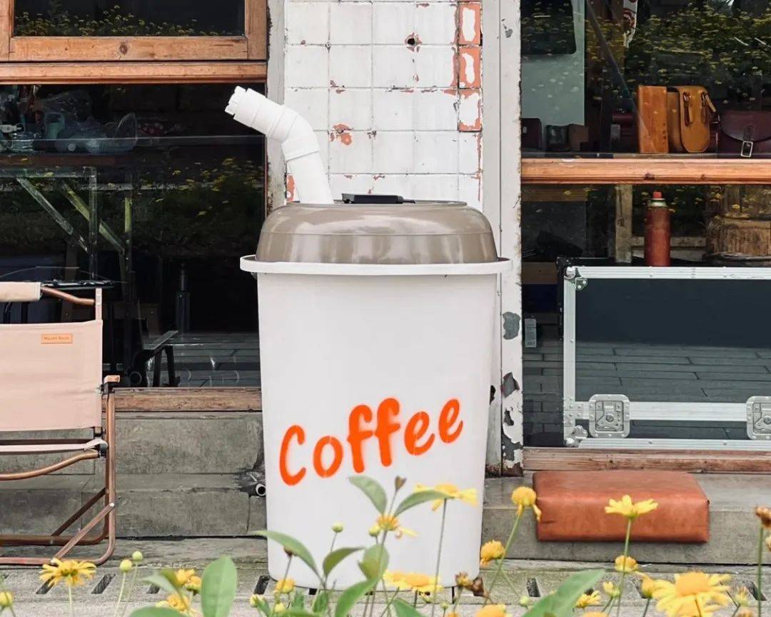 成都的昔物,是一家可以喝咖啡的手工店,店主用一个白色大垃圾桶和一个盆,手工喷漆、缠上灯管,自制成超大咖啡杯,吸引了不少顾客与之合影。