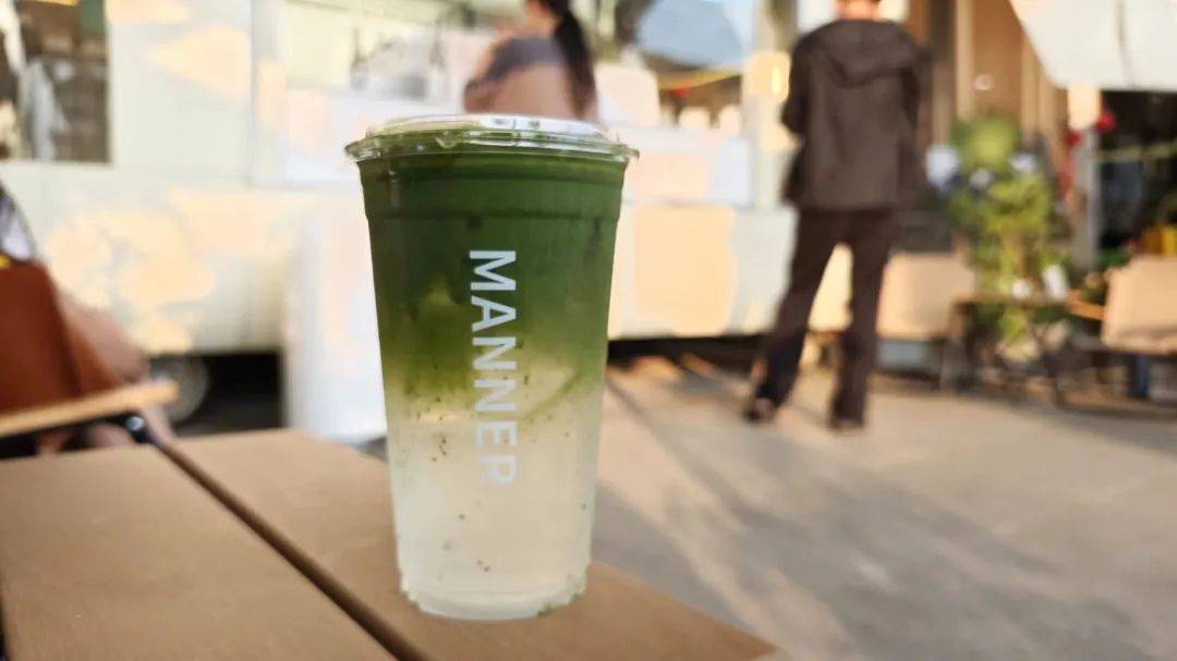 Manner的冰椰抹茶,将色泽浓郁的抹茶液倒入透明的椰子水,形成绿色渐变效果,极具视觉美感。