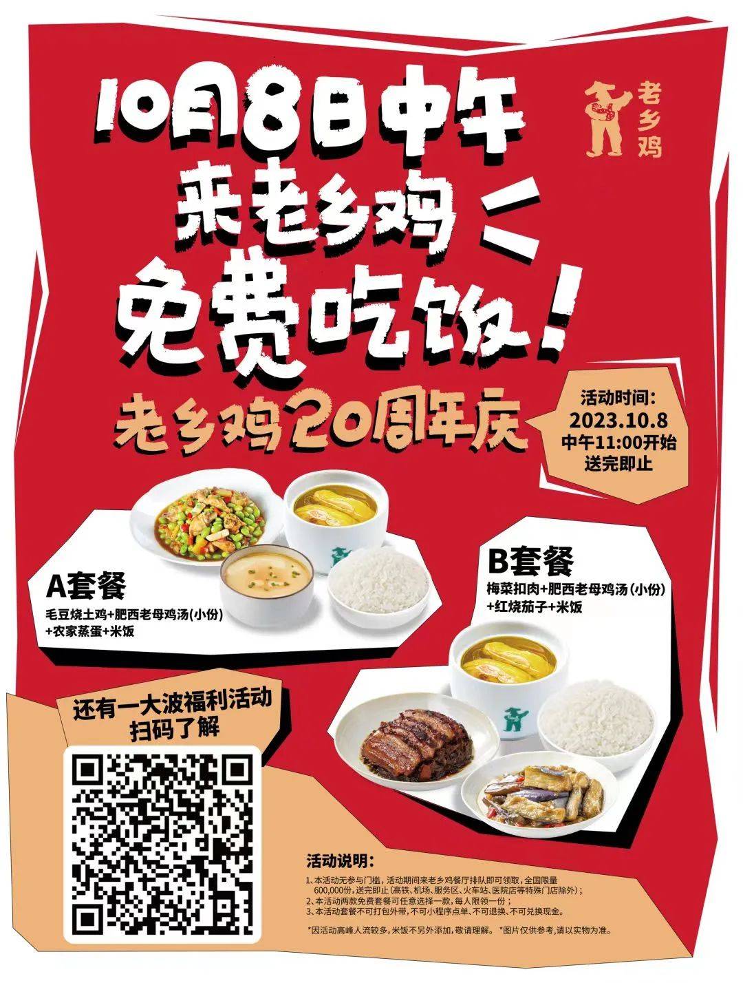 说到服务,小伙伴们有福了,10月8日中午,老乡鸡董事长请大家免费吃饭,该活动将在全国1000多家餐厅同步开展,作为中式快餐的知名品牌。老乡鸡的成功就是以消费需求为导向,不断通过产品创新和服务,赢得了广大消费者的支持。