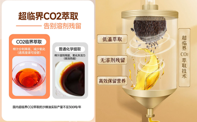 沙棘油:经超临界CO2萃取后色泽纯正、风味天然,可直接用于高端食品及保健食品,目前国内超临界CO₂萃取沙棘油年主要供应商有:甘肃艾康沙棘制品有限公司、广州合诚三先生物科技有限公司、北京宝得瑞健康产业有限公司。
