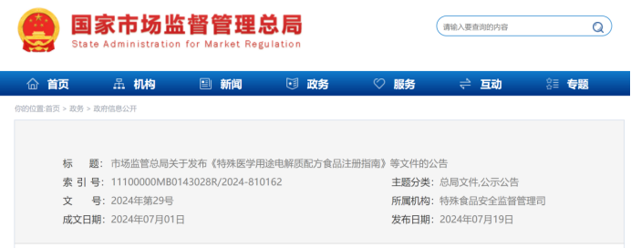 近日,国家市场监督管理总局制定了《特殊医学用途电解质配方食品注册指南》《特殊医学用途碳水化合物组件配方食品注册指南》和《特殊医学用途蛋白质组件配方食品注册指南》,并予以公告。
