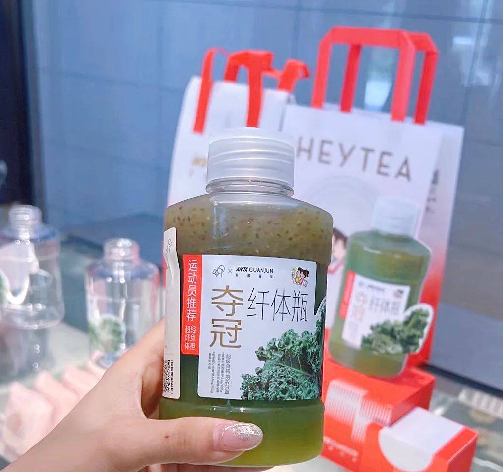 喜茶的“去火·纤体瓶”,严选地中海羽衣甘蓝、墨西哥的奇亚籽和苦瓜;羽衣纤体瓶是将羽衣甘蓝搭配奇亚籽、绿妍茶汤、苹果、柠檬、青提等水果。