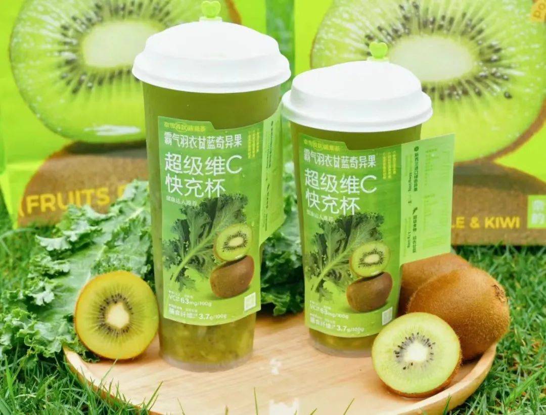 奈雪的霸气羽衣甘蓝奇异果,主打高纤维高维C、低卡轻负担,杯帖醒目标注“超级维C快充杯”的字样。