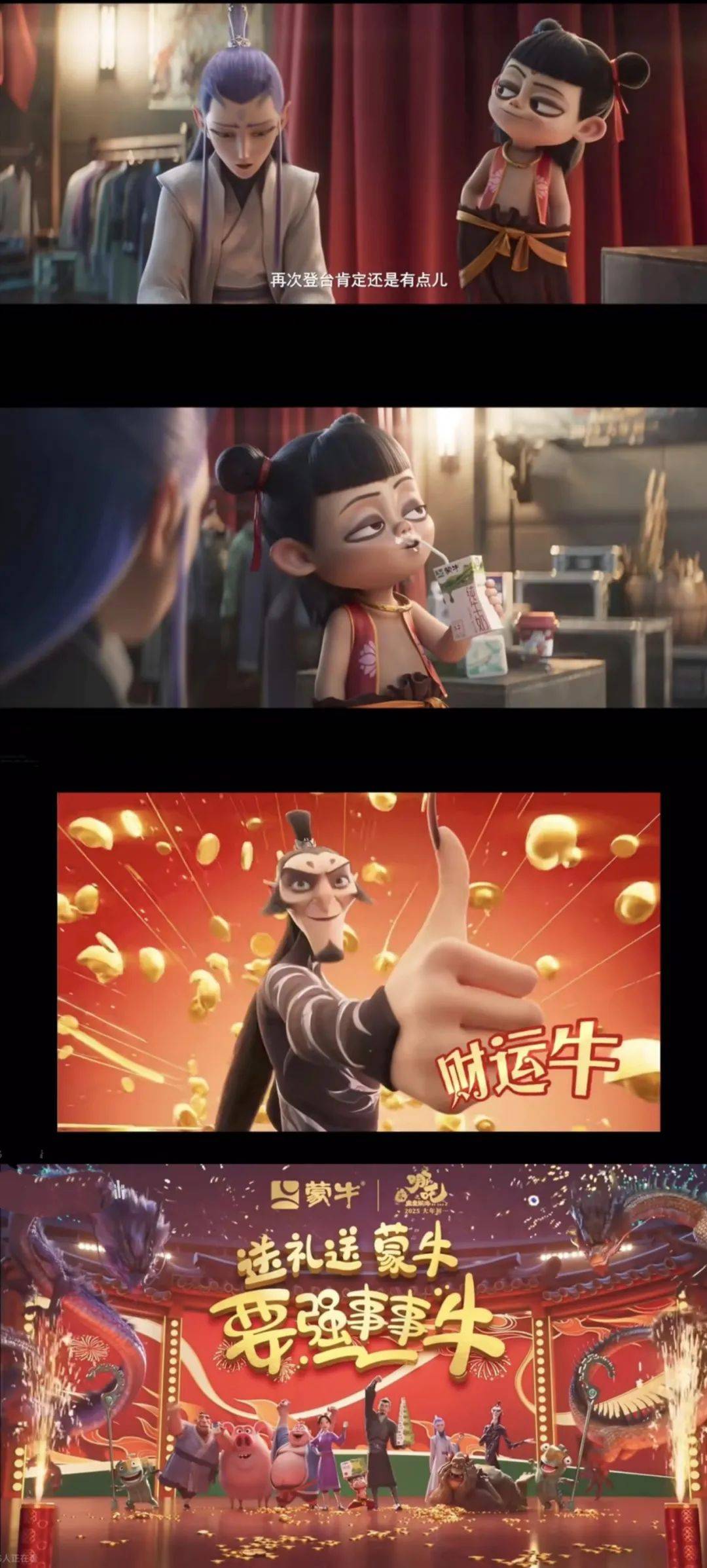 时光流转,5年后动画电影的技术不断向前发展,蒙牛与哪吒2的广告短片也迎来了更加豪华的角色阵容。从片中的小配角青铜结界兽、悲情反派申公豹、和哪吒一起升级打怪的挚友敖丙、哪吒父母等等,一起登台为大家送上祝福。在19年“喝蒙牛让人们身体更加强壮”的基础上引申出“喝蒙牛,事事牛”美好祝福,为用户开年送福气。