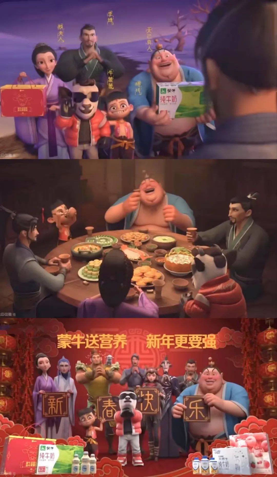 短片从姜子牙看到哪吒的黑眼圈后,觉得小哪吒一定是营养没跟上,哪吒妈殷夫人附和。吃鱼大补,但姜太公只钓了一条鱼,于是大家把目光聚焦在了蒙牛动漫形象牛蒙蒙身上,示意要吃牛肉。牛蒙蒙这时赶紧掏出牛奶产品,体现蒙牛牛奶高营养的产品卖点,众人欢聚在桌前,发现牛奶品质确实不错。短片利用轻松搞笑的风格,将牛奶卖点丝滑的植入电影小番外中,在保持电影中人物鲜明的性格特点的同时,还将牛奶产品与年夜饭场景进行了深度绑定,并且让“新年送礼选蒙牛,营养也让人身体变得更强壮”的营销主张深入人心。此举引来了双方粉丝的拍手称快,带来了双赢的局面。