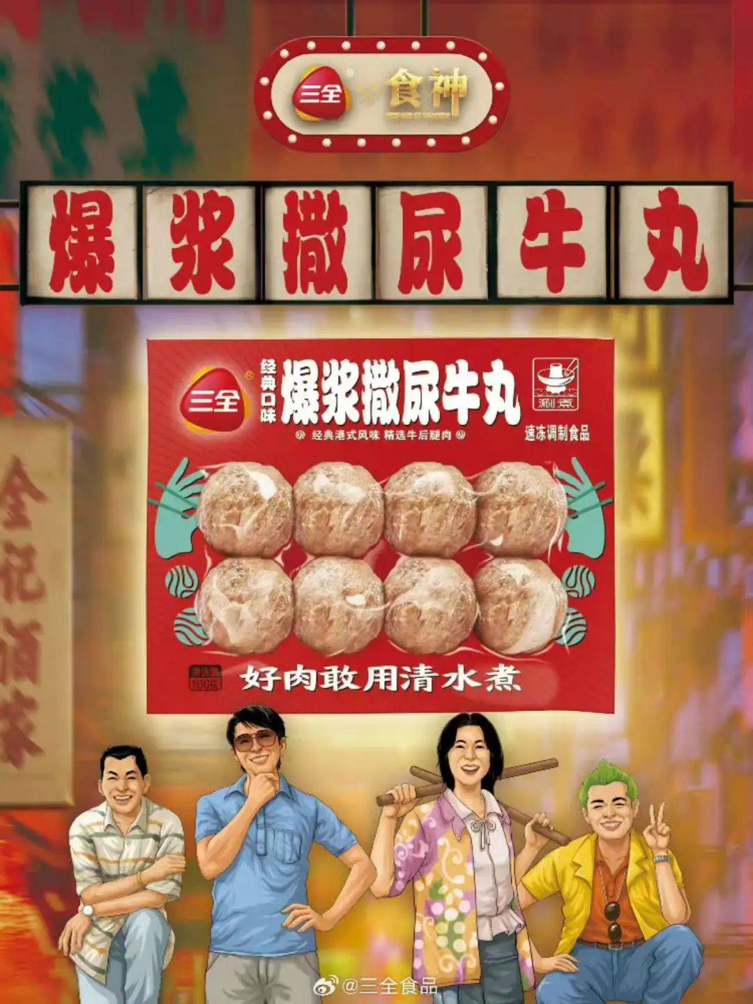 电影联名不仅存在于饮料品类,知名冻品品牌三全和经典香港电影《食神》联名,还专门拍摄了三支广告短片。短片采用电影中经典场景和电影中外形相似的演员,短片风格延续了香港电影特有的无厘头、搞笑风格。在一片诙谐幽默中突出了牛丸Q弹爆浆、鲜美多汁的产品卖点。
