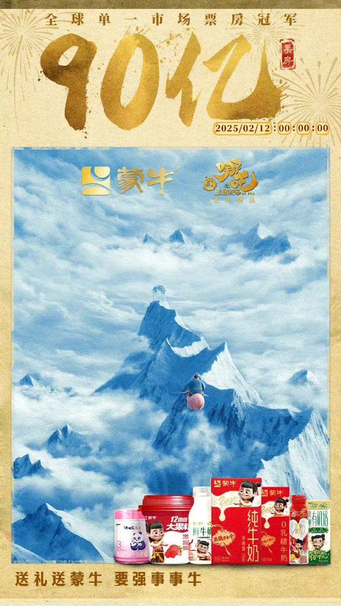 其实,蒙牛和《哪吒》系列电影的合作早有布局,自2019年《哪吒之魔童降世》起,蒙牛就和哪吒联名携手顺便还带上了同为“封神宇宙”系列的另一位成员姜子牙,推出以吃年夜饭为场景的广告片。