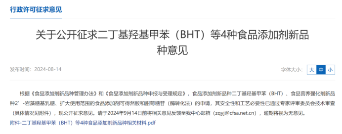 8月14日,卫健委对4种食品添加剂新品种公开征求意见,2’-岩藻糖基乳糖增加2款生产菌;可得然胶和甜菊糖苷(酶转化法)扩大使用范围;二丁基羟基甲苯(BHT)新增工艺,征求意见截止时间2024年9月14日。