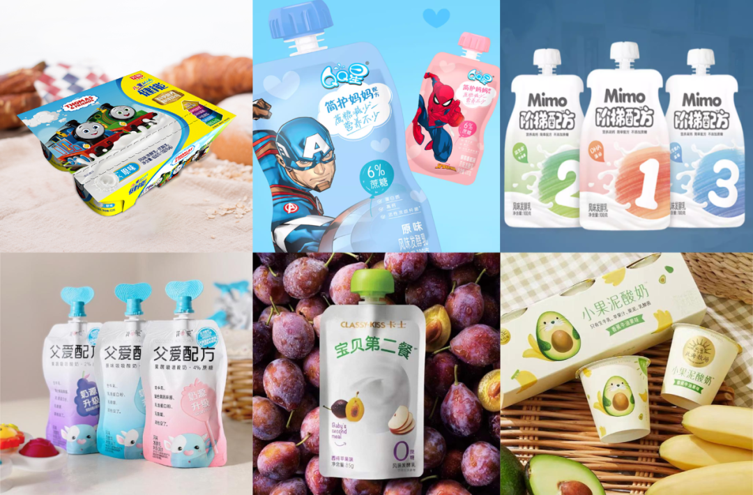 光明健能风味发酵乳·优酪乳、伊利QQ星“简护妈妈”配方风味发酵乳、新希望Mimo阶梯配方儿童酸奶、卡士宝贝第二餐原味发酵乳、北海牧场小果泥酸奶