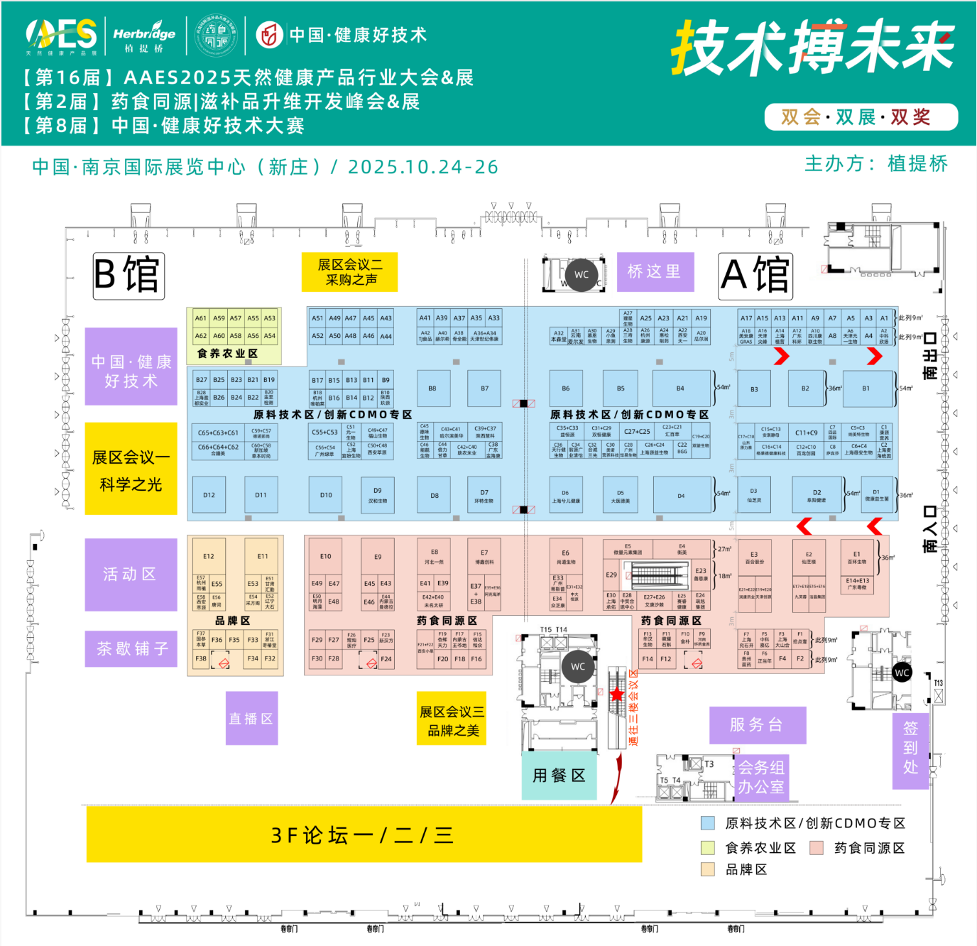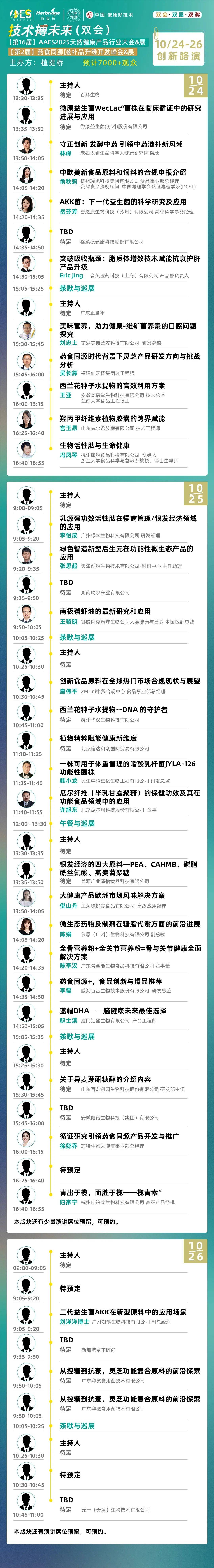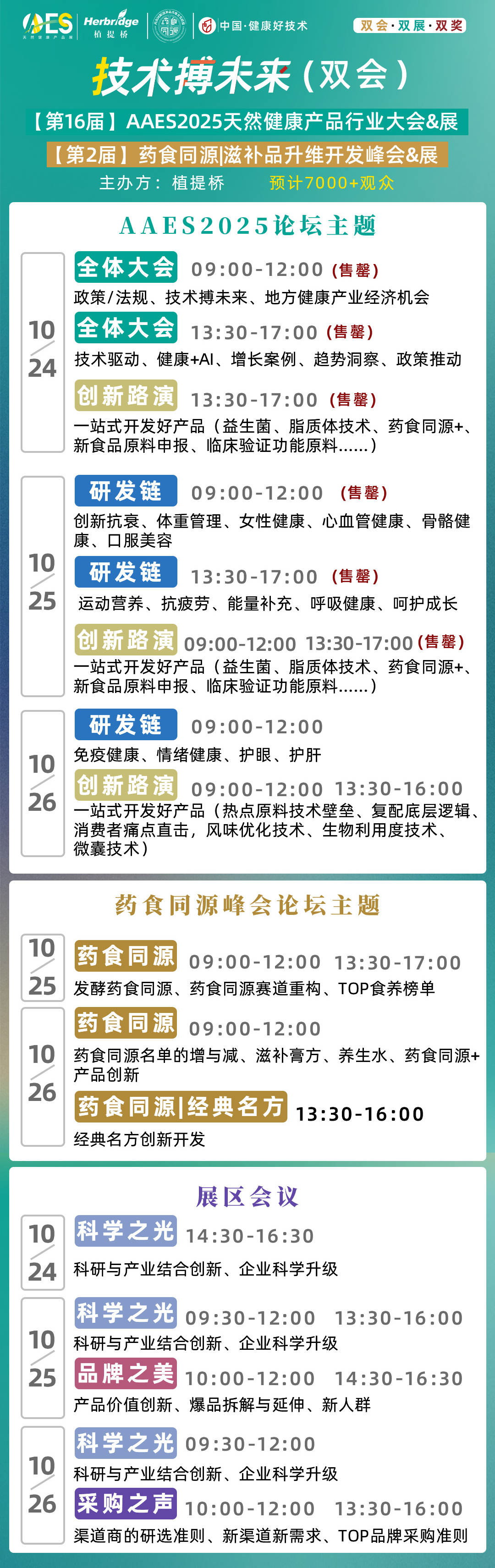 AAES2025共3天,分为全体大会、研发链、创新路演三大板块,同期还将举办第2届药食同源|滋补品升维开发峰会。此外,AAES2025还增加了三大展区会议,分别为科学之光、采购之声、品牌之美。
