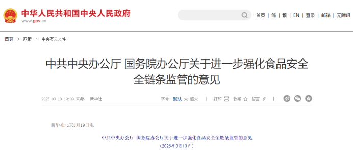 2025年3月19日,中共中央办公厅、国务院办公厅印发了《关于进一步强化食品安全全链条监管的意见》,对食品安全监管工作进行了全面部署。