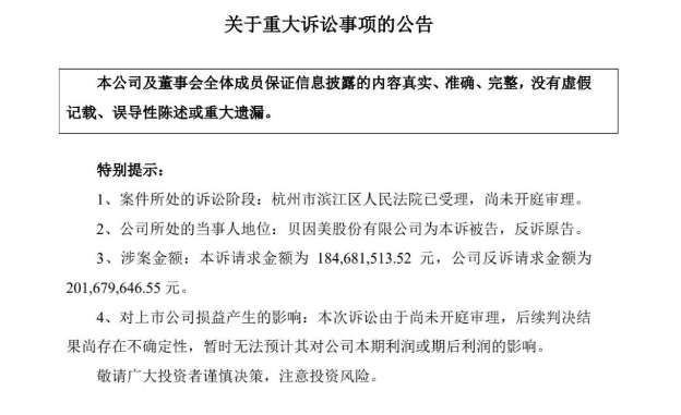 据贝因美公告显示,不久前收到杭州市滨江区人民法院发出的《受理案件通知书》等法律文书,公司与科露宝关于销售代理合同纠纷一案已立案。截至公告披露日,本案尚未开庭审理。公司所处的当事人地位:公司为本诉被告,反诉原告。涉案金额:本诉请求金额为1.85亿元,公司反诉请求金额为2.02亿元。