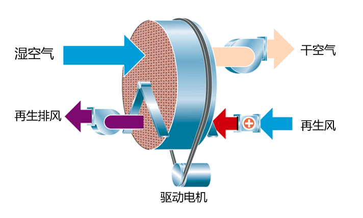 具体的原理主要是,当潮湿空气通过转轮的处理区域时,湿空气中的水蒸气被转轮材料上的干燥剂吸附。接下来,当转轮转到再生区域时,高温再生空气通过转轮,干燥剂上的水分被脱附转轮上的干燥剂被再生,转轮重新获得吸收水蒸气的能力。此外,转轮在工作时始终保持缓慢旋转(8~10转/小时),整个过程循环不断地进行,为用户持续不断提供干空气。