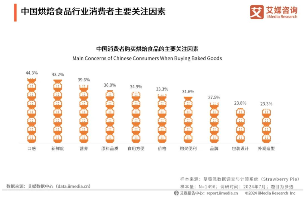 艾媒咨询的报告显示,消费者关注烘焙产品的前三因素分别是口感、新鲜度及营养,占比分别为44.3%、43.2及39.6%。