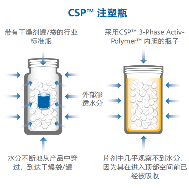 该解决方案类似于目前的益生菌包装,不同之处在于,使用公司的3-Phase Activ-Polymer™ 技术平台,与容器一体成型注塑,能够定制化控制水分吸附,可以做到以下2点:
