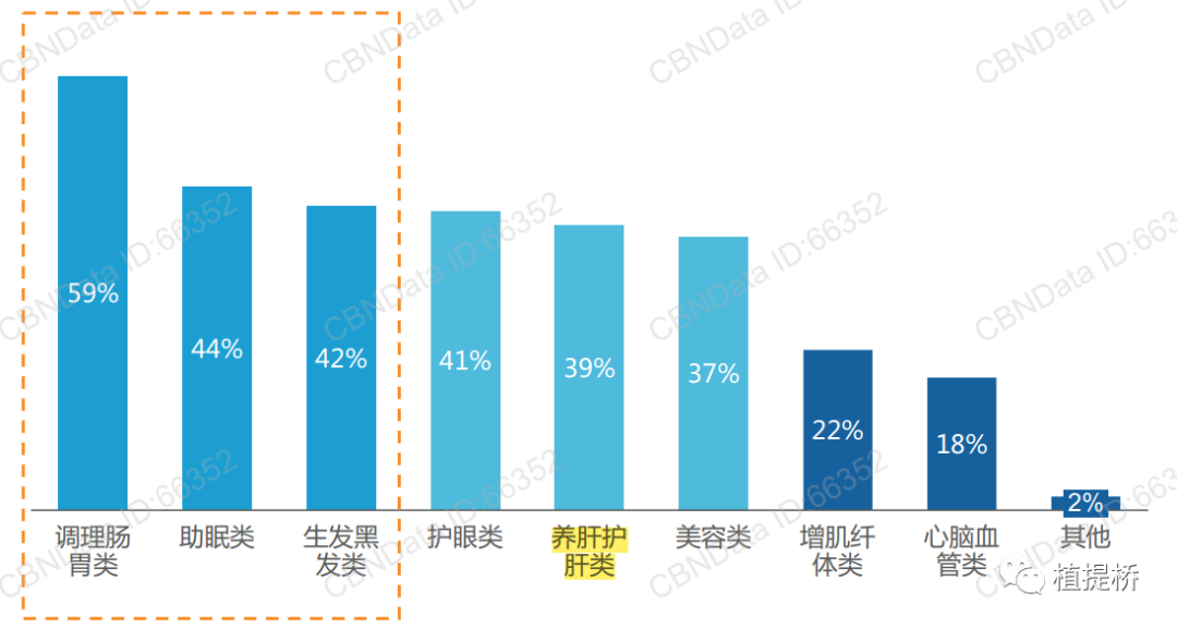 据亿欧智库调查表明,面临较大的工作和生活压力,年轻人常常遭遇肠胃问题、失眠问题、脱发等健康问题,因此他们常使用的前五种膳食养生产品分别是调理肠胃类、助眠类、生发黑发类、护眼类和养肝护肝类产品。