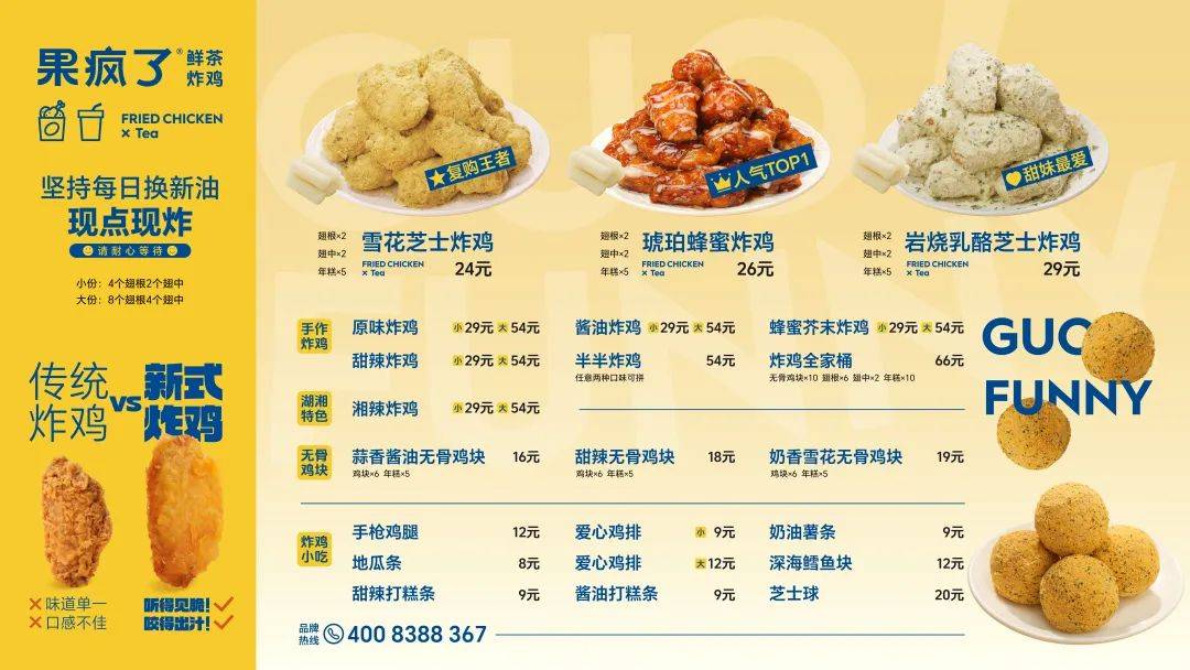 产品结构上,增加了中式炸鸡、薯条、鸡排、年糕等十几款产品,而茶饮则从原来的30多款砍到了十几款,直接分成两个菜单,顾客可以单点,也可以直接选择“炸鸡+饮品”套餐。